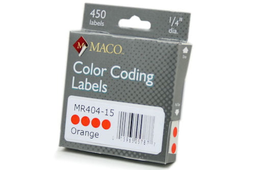 MR 404 15 0.25″ diameter color coding circles with permanent adhesive in orange color. Pack of 450. Also references MMR404-15 / MR404-15.